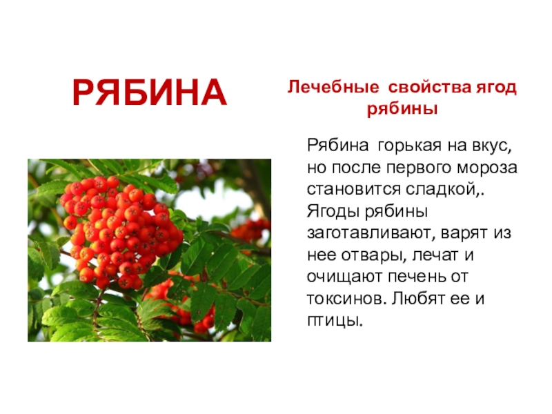 после первого мороза становится сладкой,. Ягоды рябины заготавливают, варят из нее отвары, лечат и очищают печень от токсинов. Любят ее и птицы.