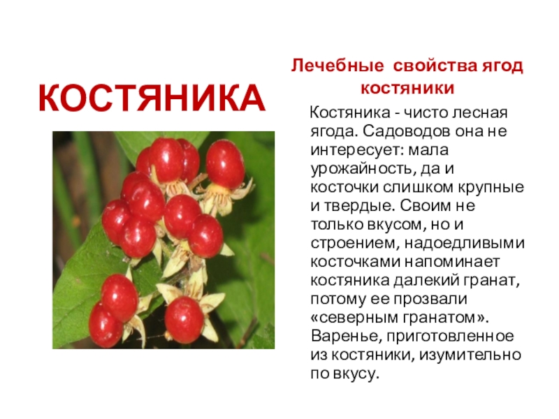 Садоводов она не интересует: мала урожайность, да и косточки слишком крупные и твердые. Своим не только вкусом, но и строением, надоедливыми косточками напоминает костяника далекий гранат, потому ее прозвали «северным гранатом».