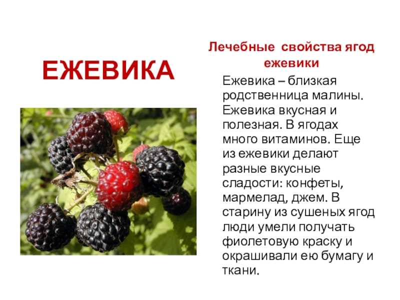 Ежевика вкусная и полезная. В ягодах много витаминов. Еще из ежевики делают разные вкусные сладости: конфеты, мармелад, джем. В старину из сушеных ягод люди умели получать фиолетовую краску и окрашивали ею бумагу и ткани.