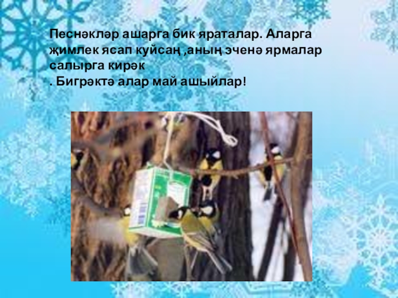 Слайд 23Песнәкләр ашарга бик яраталар. Аларга җимлек ясап куйсаң ,аның эченә ярмалар