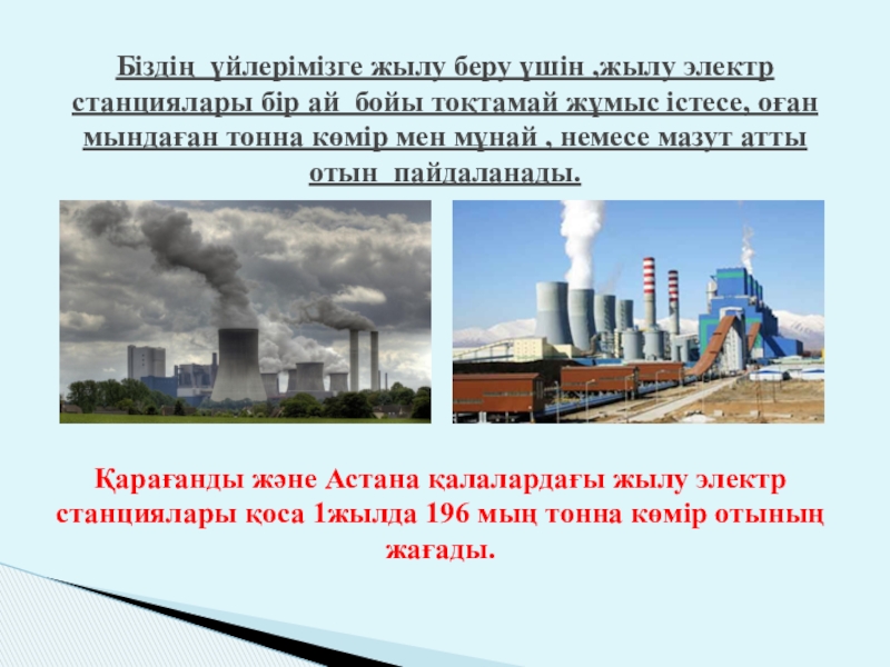 Қарағанды және Астана қалалардағы жылу электр станциялары қоса 1жылда 196 мың тонна көмір отының жағады.