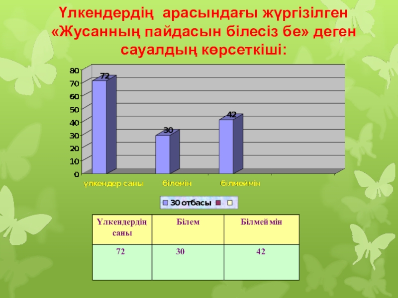 Слайд 15Үлкендердің арасындағы жүргізілген «Жусанның пайдасын білесіз бе» деген сауалдың көрсеткіші: