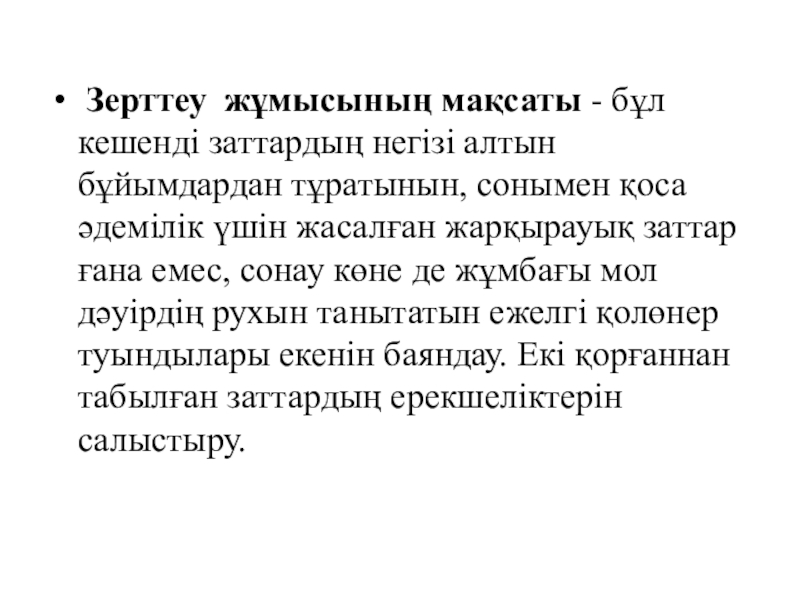 тұратынын, сонымен қоса әдемілік үшін жасалған жарқырауық заттар ғана емес, сонау көне де жұмбағы мол дәуірдің рухын танытатын ежелгі қолөнер туындылары екенін баяндау. Екі қорғаннан табылған заттардың ерекшеліктерін салыстыру.