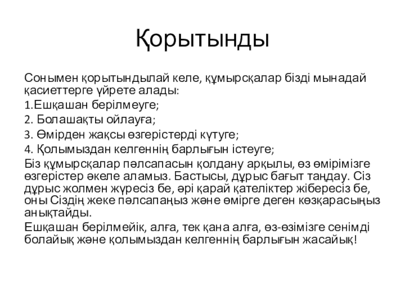 Сонымен қорытындылай келе, құмырсқалар бізді мынадай қасиеттерге үйрете алады: