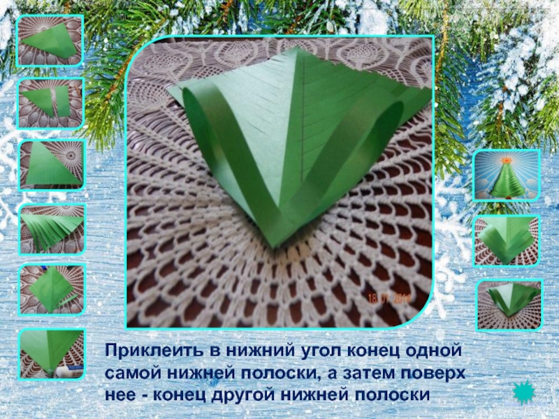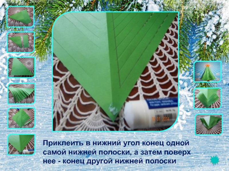 Слайд 9Приклеить в нижний угол конец одной самой нижней полоски, а затем поверх
