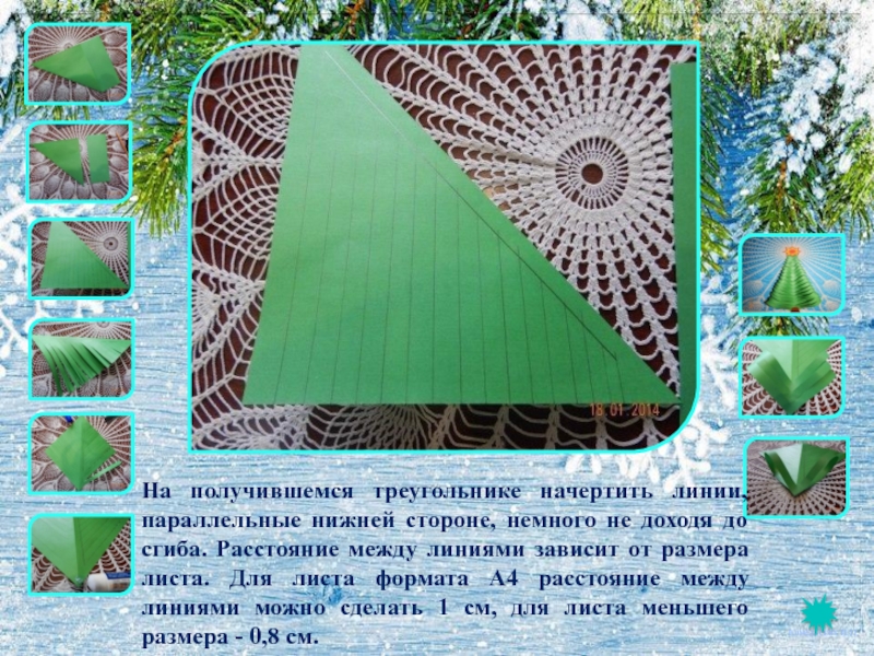На получившемся треугольнике начертить линии, параллельные нижней стороне, немного не доходя до сгиба. Расстояние между линиями зависит