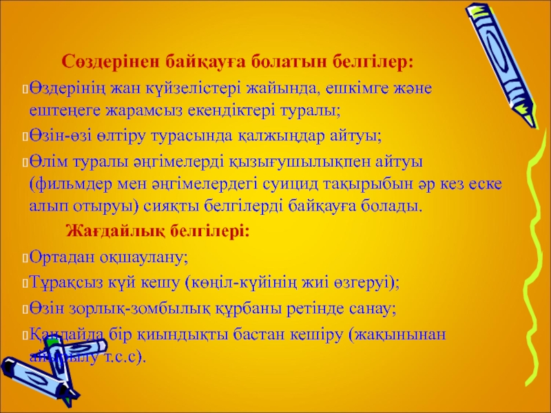 Өлім туралы әңгімелерді қызығушылықпен айтуы (фильмдер мен әңгімелердегі суицид тақырыбын әр кез еске алып отыруы) сияқты белгілерді байқауға болады.