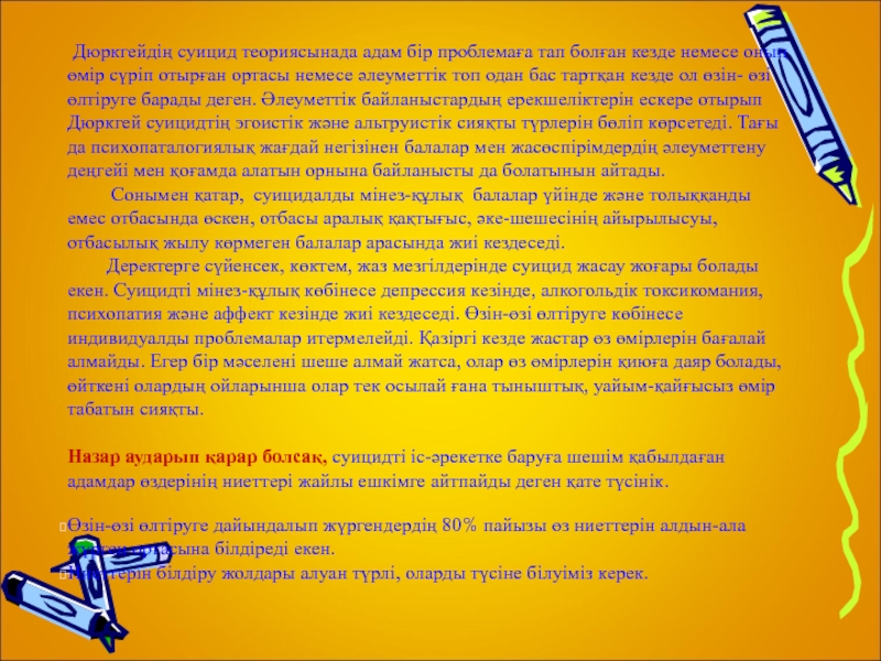 Дюркгейдің суицид теориясынада адам бір проблемаға тап болған кезде немесе