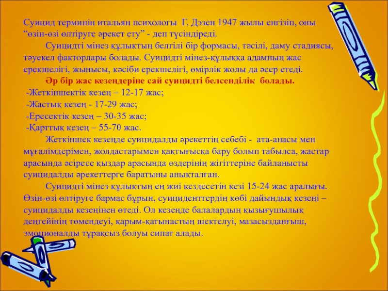 Суицид терминін итальян психологы Г. Дэзен 1947 жылы енгізіп, оны “өзін-өзі