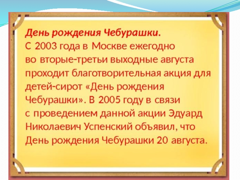 Праздник у Чебурашки50 лет исполнилось ушастому малышу.