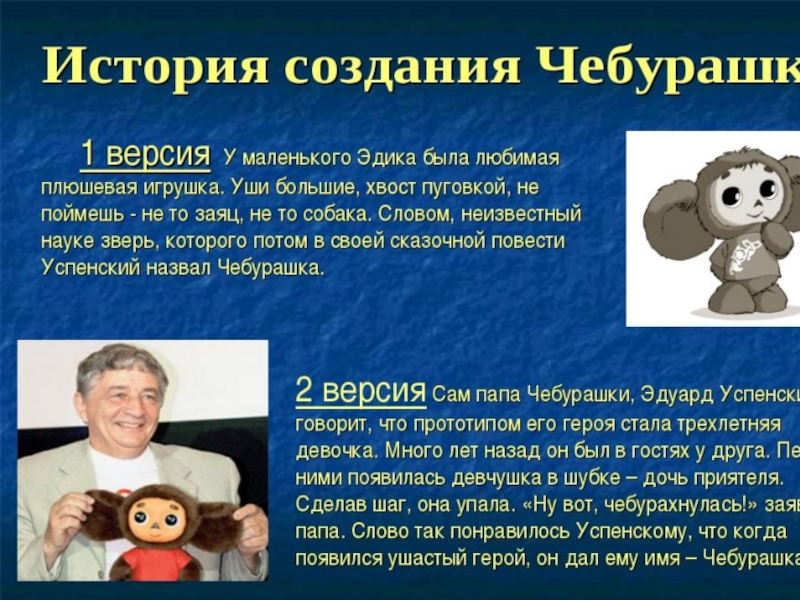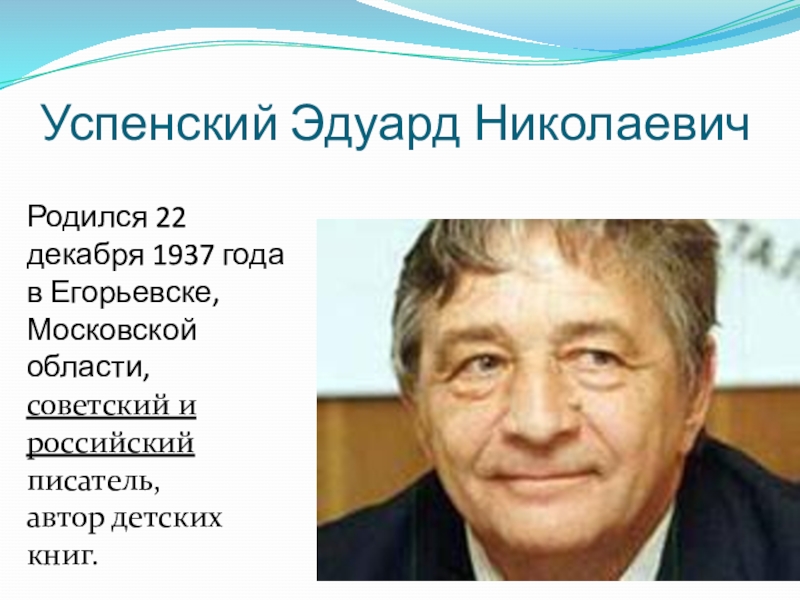 Успенский Эдуард Николаевич Родился 22 декабря 1937 года в Егорьевске, Московской области, советский и российский писатель, автор детских книг.