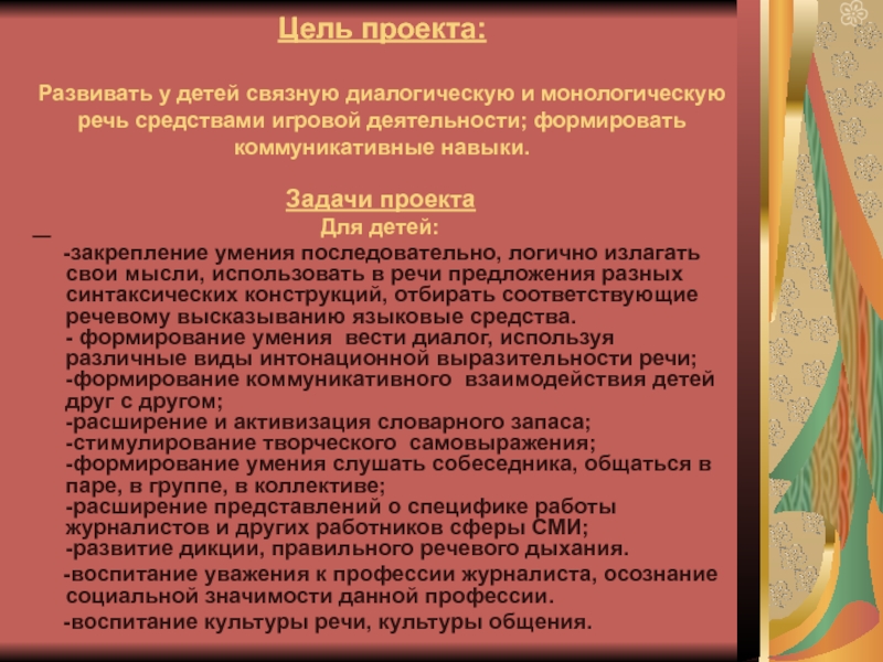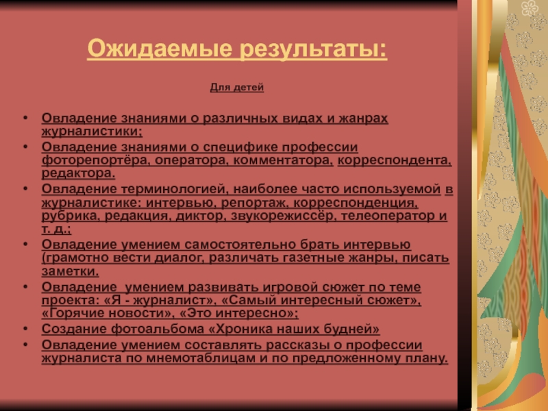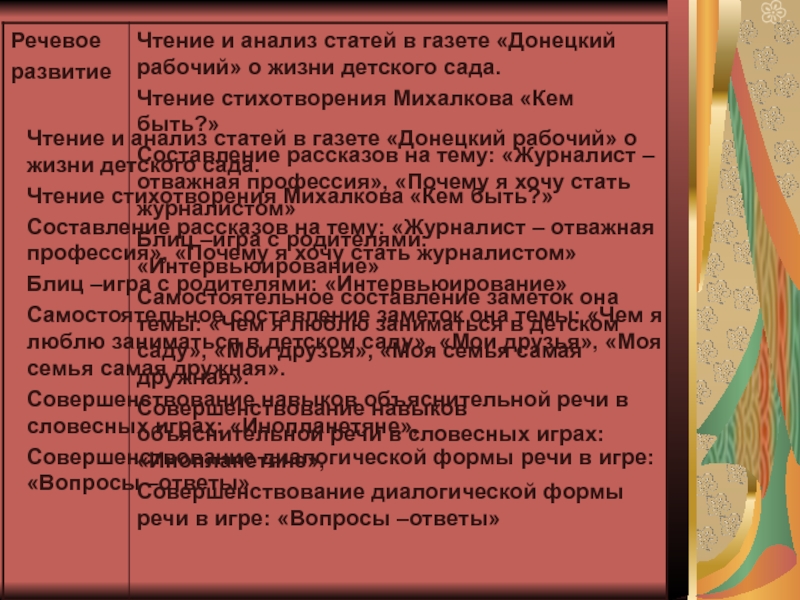 Овладение умением развивать игровой сюжет по теме проекта: «Я - журналист», «Самый интересный сюжет», «Горячие новости», «Это интересно»;