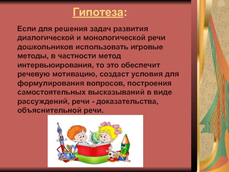 дошкольников использовать игровые методы, в частности метод интервьюирования, то это обеспечит речевую мотивацию, создаст условия для формулирования вопросов, построения самостоятельных высказываний в виде рассуждений, речи - доказательства, объяснительной речи.