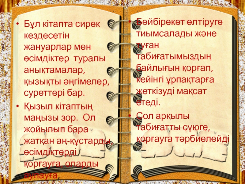 Бейбірекет өлтіруге тиымсалады және туған табиғатымыздың байлығын қорғап, кейінгі ұрпақтарға жеткізуді мақсат етеді.