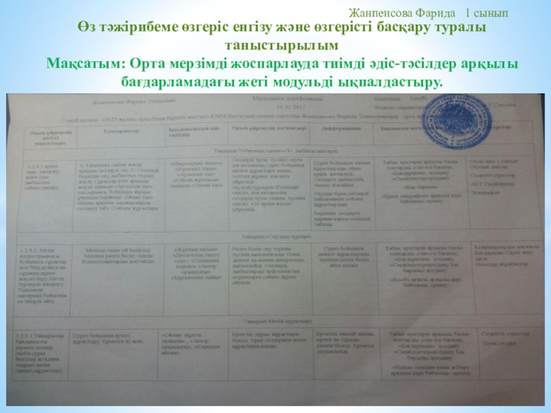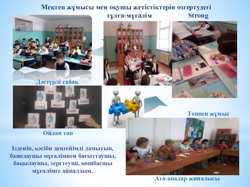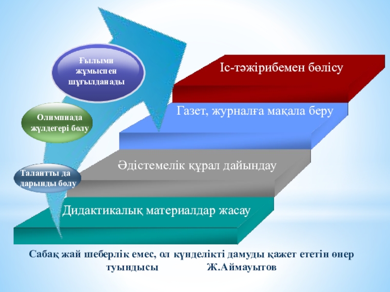 Ізденіп, кәсіби деңгейімді дамытып, баяндаушы мұғалімнен бағыттаушы, бақылаушы, зерттеуші, көшбасшы мұғалімге айналдым.