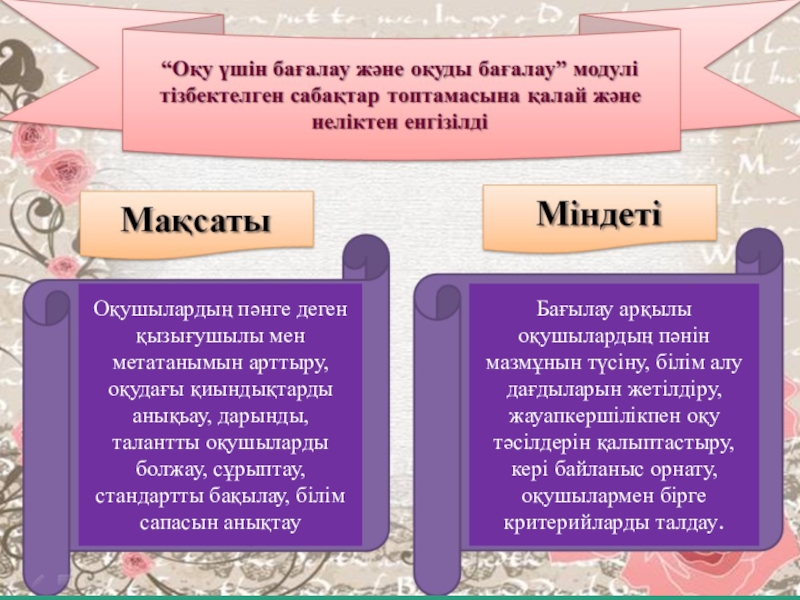 Бағылау арқылы оқушылардың пәнін мазмұнын түсіну, білім алу дағдыларын жетілдіру, жауапкершілікпен оқу тәсілдерін қалыптастыру, кері байланыс орнату, оқушылармен бірге критерийларды талдау.