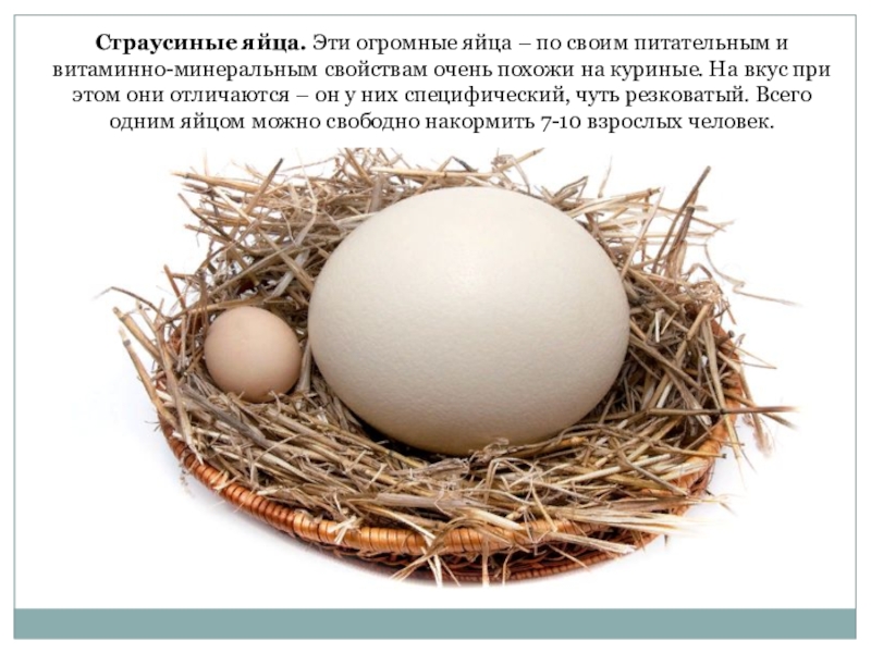 Они содержат мало жира, но зато много витаминов и минералов. Иногда их даже называют «естественными витаминными комплексами». Вкусовые качества продукта очень схожи с куриными яйцами. Но если разбить яйцо, желток и белок по цвету будут отличаться.