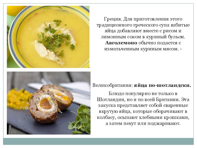 Блюдо популярно не только в Шотландии, но и по всей Британии. Эта закуска представляет собой сваренные вкрутую яйца, которые оборачивают в колбасу, осыпают хлебными крошками, а затем пекут или поджаривают.