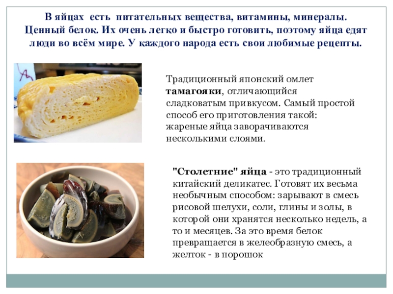 "Столетние" яйца - это традиционный китайский деликатес. Готовят их весьма необычным способом: зарывают в смесь рисовой шелухи, соли, глины и золы, в которой они хранятся несколько недель, а то и месяцев. За это время белок превращается в желеобразную смесь, а желток - в порошок