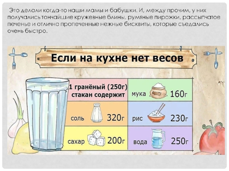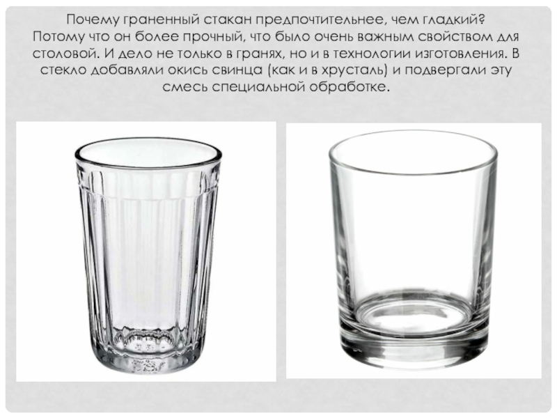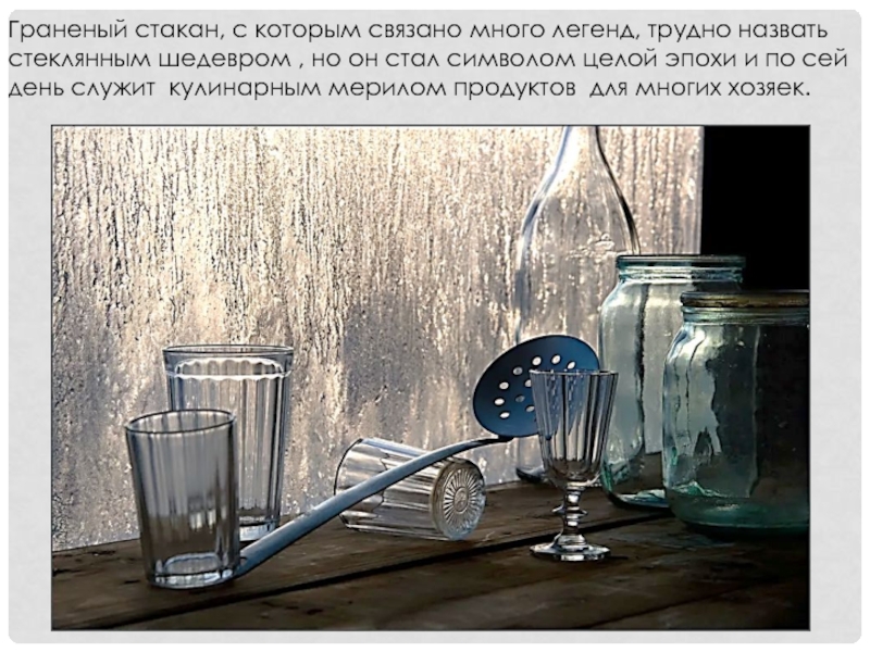 По сей день граненый стакан — излюбленная мерка для хозяек при отмеривании продуктов. Во многих рецептах, где нужно достаточно большое количество продуктов (муки, сахара, крупы), их отмеряют именно стаканами.