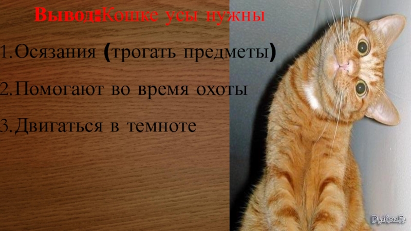 Вывод:Кошке усы нужны Осязания (трогать предметы)Помогают во время охотыДвигаться в темноте
