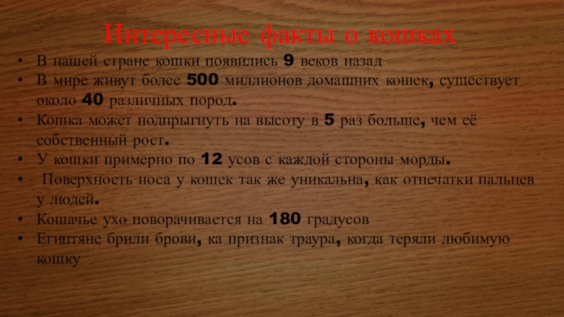 Интересные факты о кошкахВ нашей стране кошки появились 9 веков назадВ мире живут более 500 миллионов домашних кошек, существует