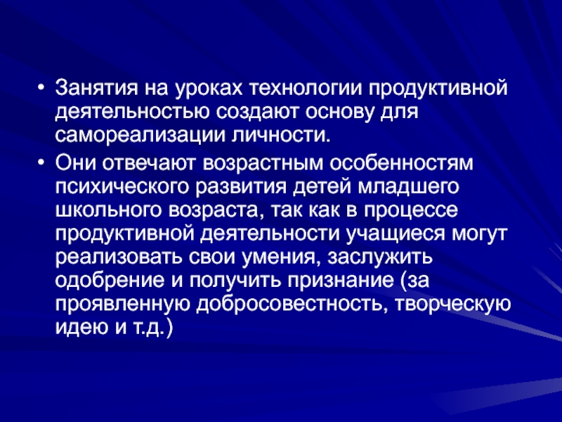 Занятия на уроках технологии продуктивной деятельностью создают основу для самореализации личности. Они отвечают возрастным особенностям психического развития