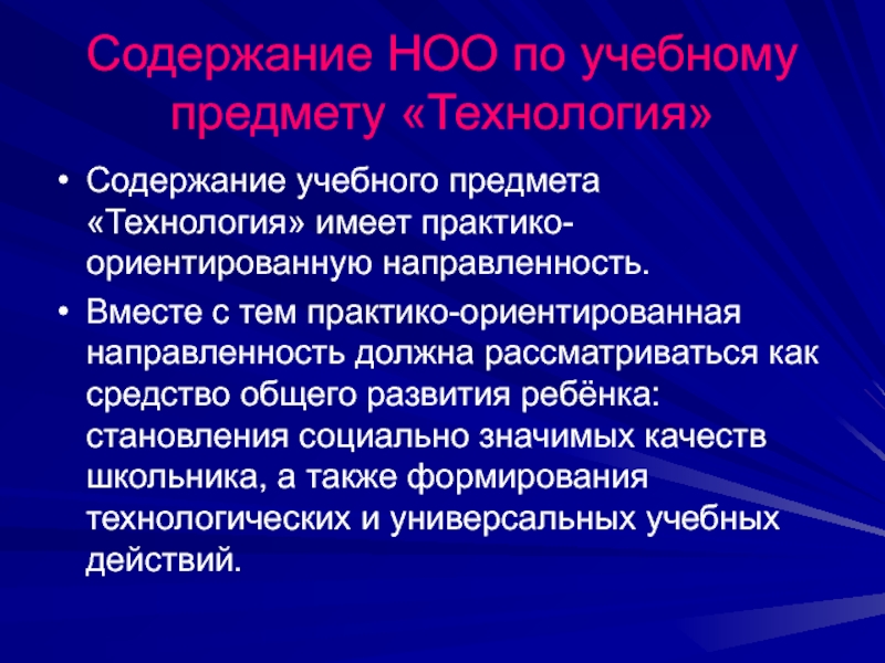 Содержание НОО по учебному предмету «Технология»Содержание учебного предмета «Технология» имеет практико-ориентированную направленность. Вместе с тем практико-ориентированная направленность
