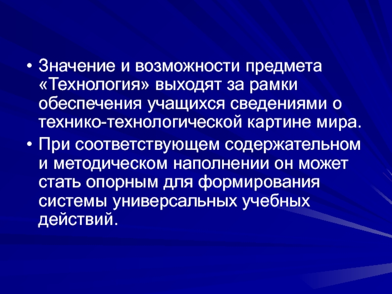 Значение и возможности предмета «Технология» выходят за рамки обеспечения учащихся сведениями о технико-технологической картине мира.При соответствующем содержательном