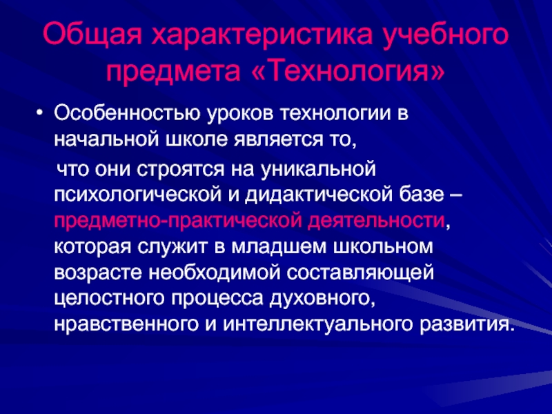 Общая характеристика учебного предмета «Технология»Особенностью уроков технологии в начальной школе является то, что они строятся на уникальной психологической и дидактической базе – предметно-практической деятельности, которая служит в младшем школьном возрасте необходимой составляющей целостного процесса