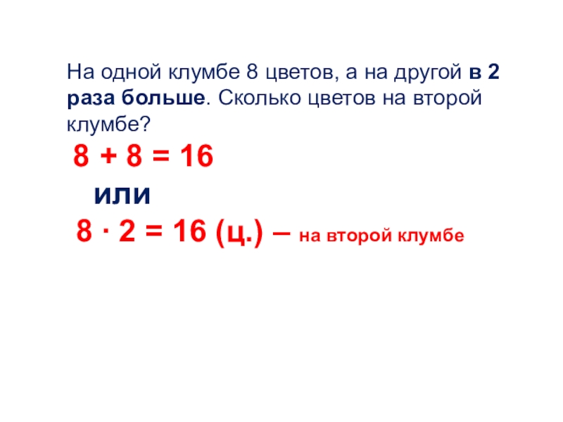 На одной клумбе 8 цветов, а на другой в 2 раза больше. Сколько цветов на второй клумбе?