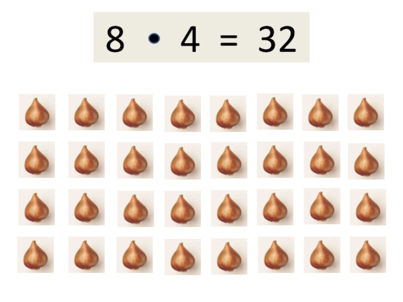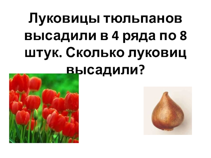 Слайд 5Луковицы тюльпанов высадили в 4 ряда по 8 штук. Сколько луковиц