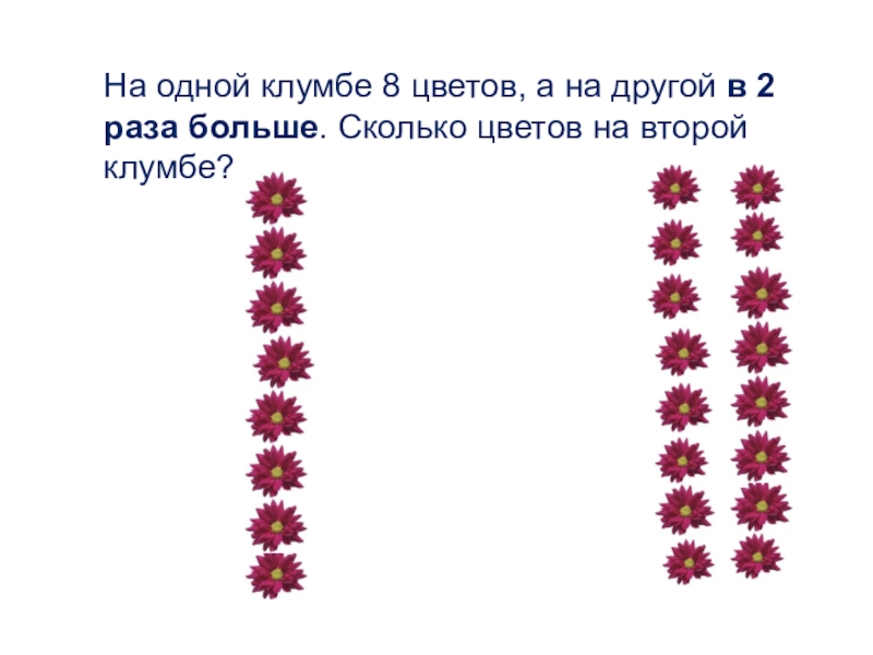 Слайд 10На одной клумбе 8 цветов, а на другой в 2 раза