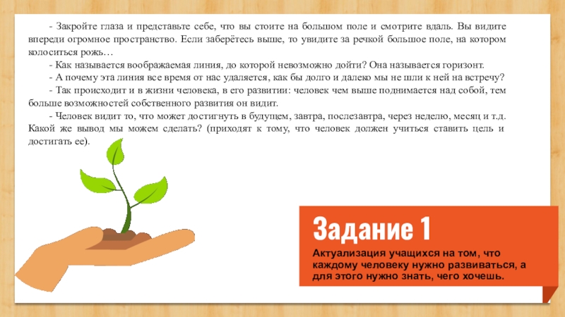 - Человек видит то, что может достигнуть в будущем, завтра, послезавтра, через неделю, месяц и т.д. Какой же вывод мы можем сделать? (приходят к тому, что человек должен учиться ставить цель и достигать ее).