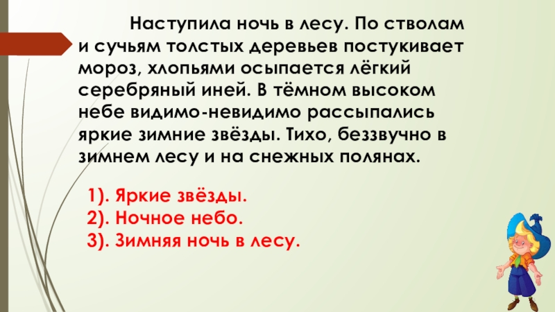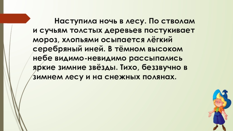 Наступила ночь в лесу. По стволам и сучьям толстых деревьев постукивает мороз, хлопьями осыпается лёгкий серебряный иней. В тёмном высоком небе видимо-невидимо рассыпались яркие зимние звёзды. Тихо, беззвучно в зимнем лесу и на снежных полянах.