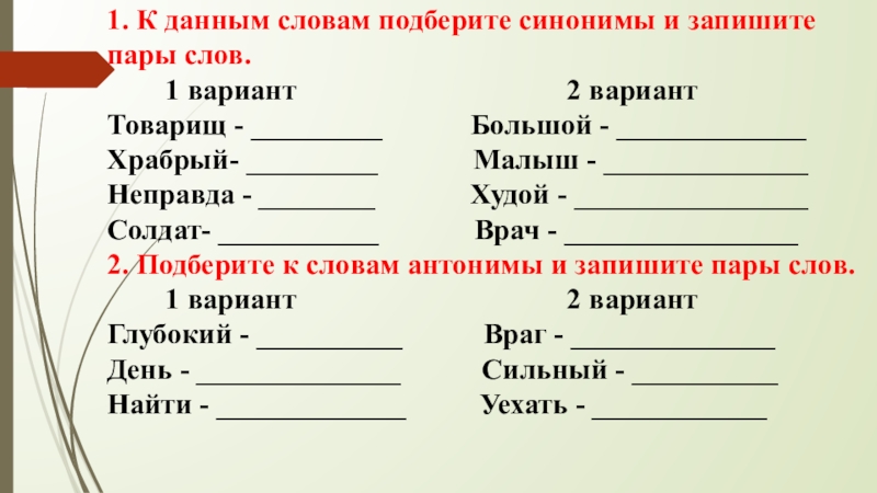 Слайд 51. К данным словам подберите синонимы и запишите пары слов.