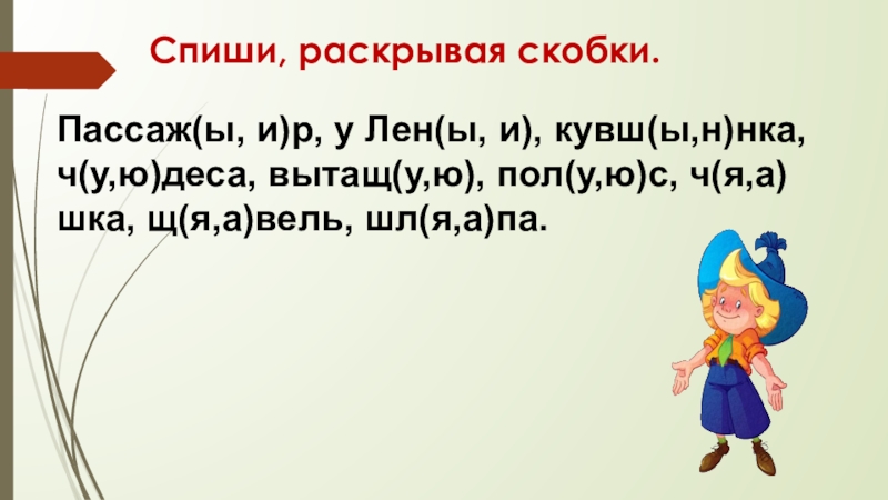 Пассаж(ы, и)р, у Лен(ы, и), кувш(ы,н)нка, ч(у,ю)деса, вытащ(у,ю), пол(у,ю)с,