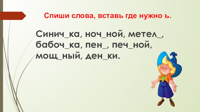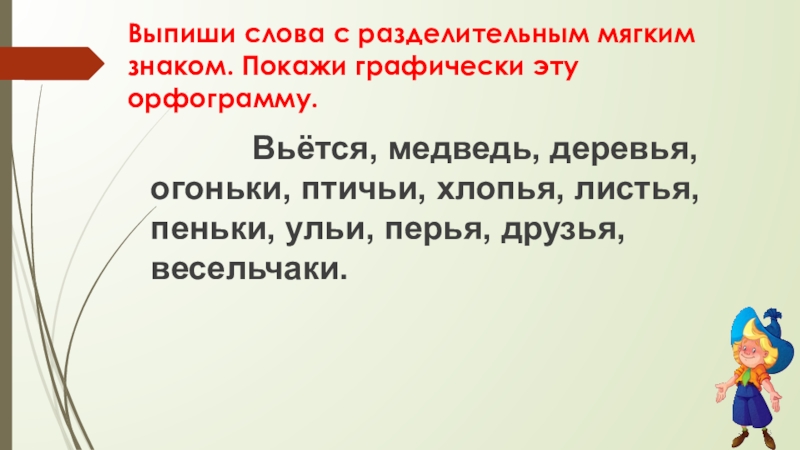 Слайд 12Выпиши слова с разделительным мягким знаком. Покажи графически эту орфограмму.