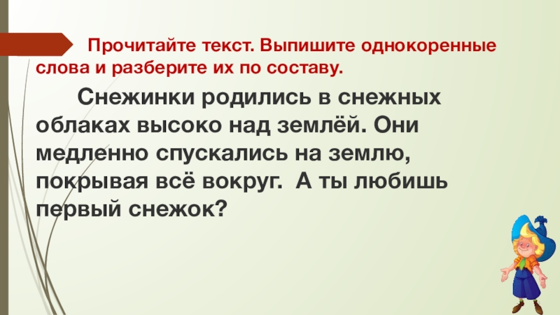 Слайд 8 Прочитайте текст. Выпишите однокоренные слова и