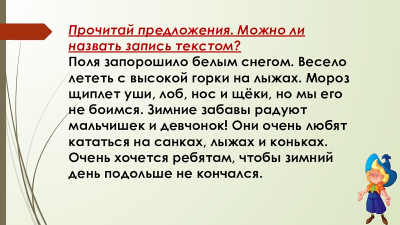 Слайд 9Прочитай предложения. Можно ли назвать запись текстом?