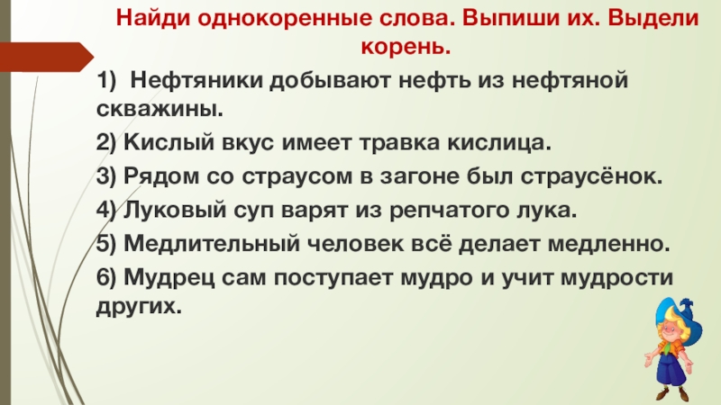 Слайд 7 Найди однокоренные слова. Выпиши их. Выдели корень.