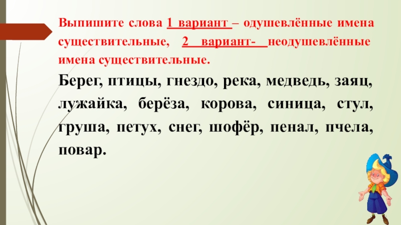 Слайд 13Выпишите слова 1 вариант – одушевлённые имена существительные, 2 вариант- неодушевлённые