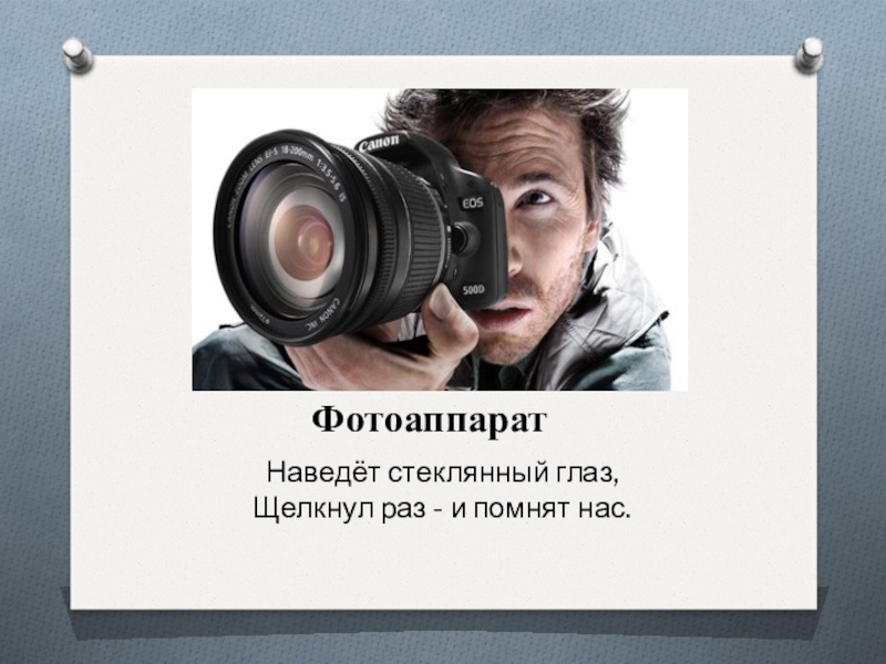 Слайд 2Наведёт стеклянный глаз,  Щелкнул раз - и помнят нас.