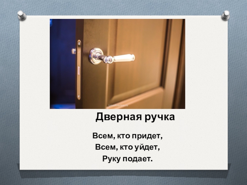 Всем, кто придет,Всем, кто уйдет,Руку подает.Дверная ручка