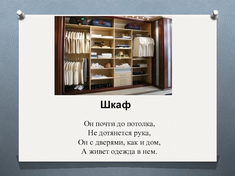 Он почти до потолка, Не дотянется рука, Он с дверями, как и дом, А живет одежда в