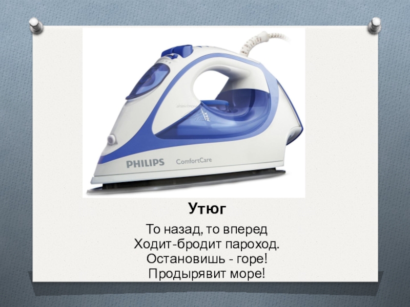 То назад, то вперед Ходит-бродит пароход. Остановишь - горе! Продырявит море!Утюг
