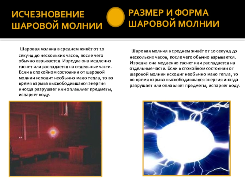 Шаровая молния в среднем живёт от 10 секунд до нескольких часов, после чего обычно взрывается. Изредка она медленно гаснет или распадается на отдельные части. Если в спокойном состоянии от шаровой молнии исходит необычно мало тепла, то во время взрыва высвободившаяся энергия иногда разрушает или оплавляет предметы, испаряет воду.