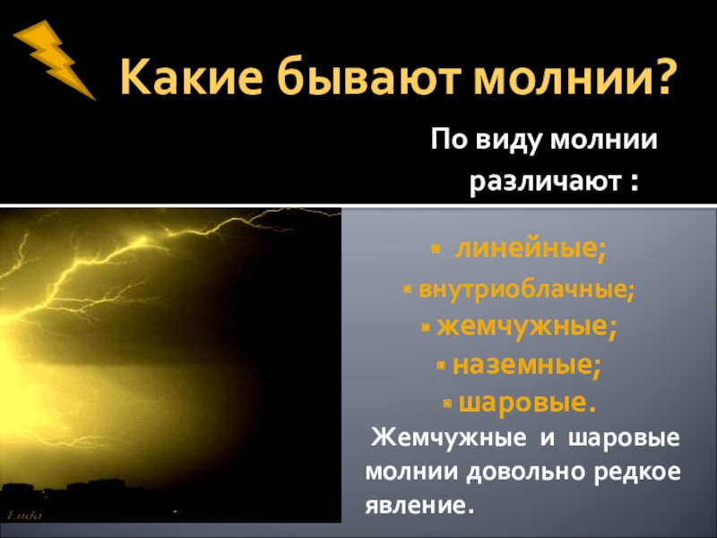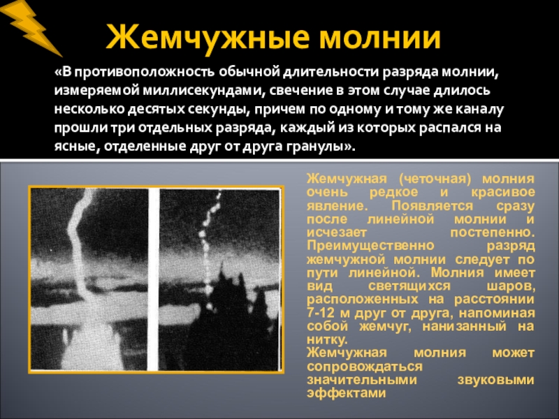 Жемчужная (четочная) молния очень редкое и красивое явление. Появляется сразу после линейной молнии и исчезает постепенно. Преимущественно разряд жемчужной молнии следует по пути линейной. Молния имеет вид светящихся шаров, расположенных на расстоянии 7-12 м друг от друга, напоминая собой жемчуг, нанизанный на нитку.