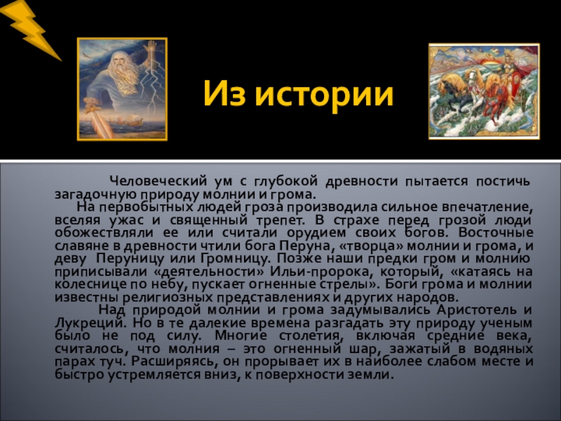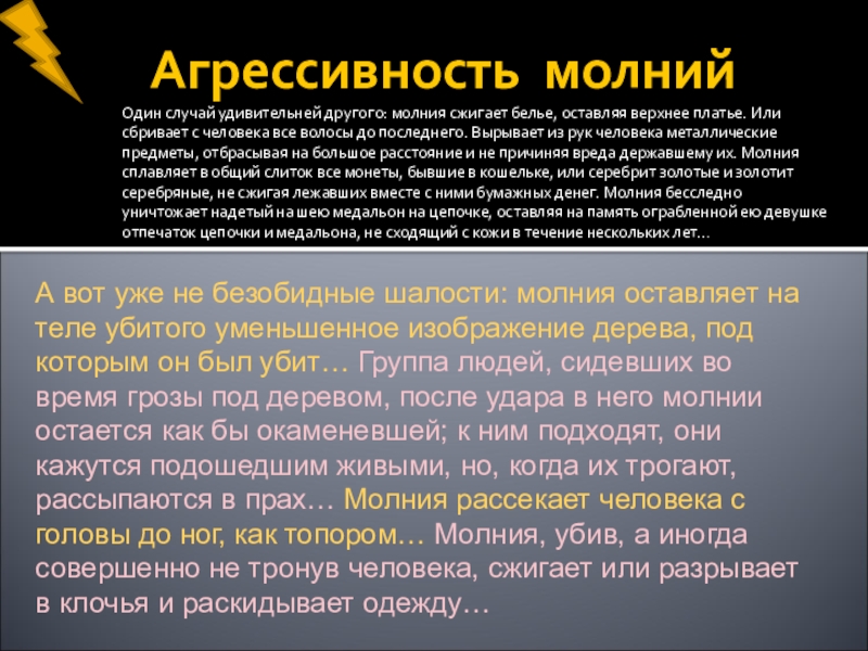 А вот уже не безобидные шалости: молния оставляет на теле убитого уменьшенное изображение дерева, под которым он был убит… Группа людей, сидевших во время грозы под деревом, после удара в него молнии остается как бы окаменевшей; к ним подходят, они кажутся подошедшим живыми, но, когда их трогают, рассыпаются в прах… Молния рассекает человека с головы до ног, как топором… Молния, убив, а иногда совершенно не тронув человека, сжигает или разрывает в клочья и раскидывает одежду…