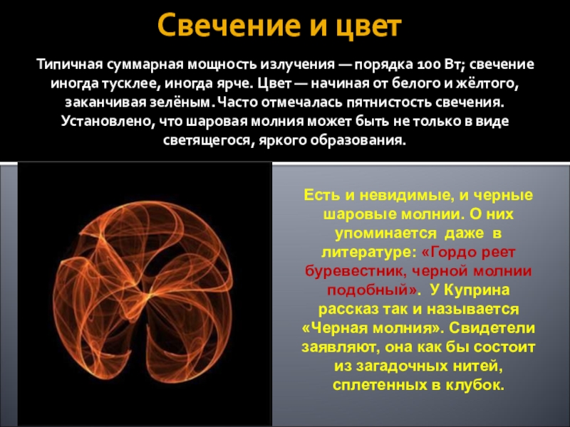 Есть и невидимые, и черные шаровые молнии. О них упоминается даже в литературе: «Гордо реет буревестник, черной молнии подобный». У Куприна рассказ так и называется «Черная молния». Свидетели заявляют, она как бы состоит из загадочных нитей, сплетенных в клубок.